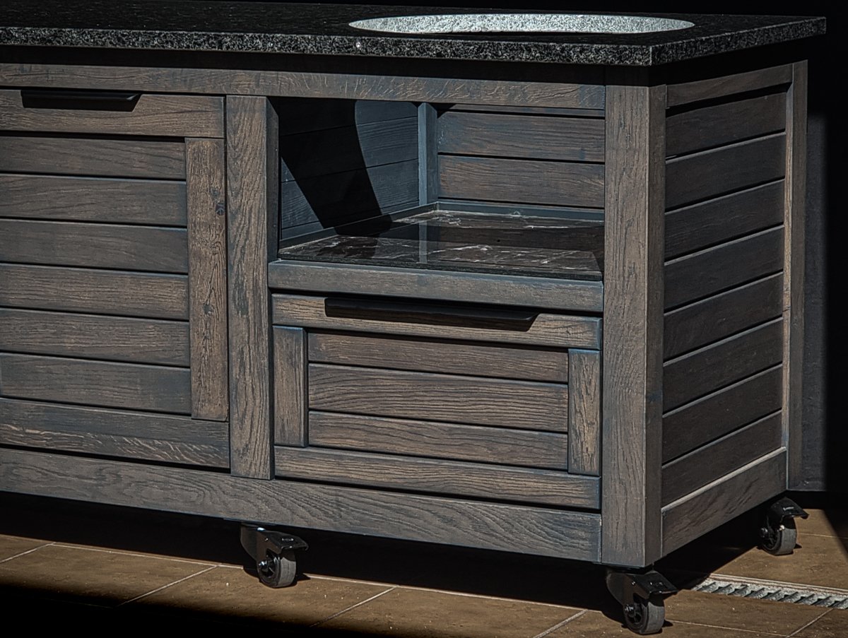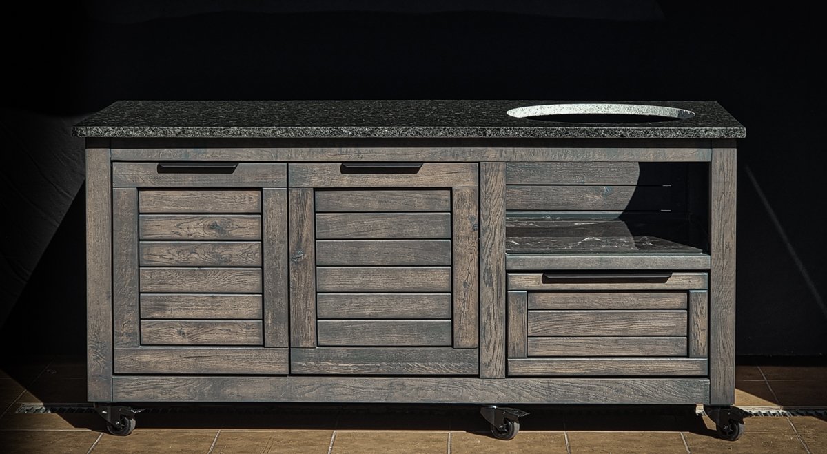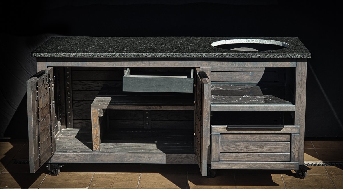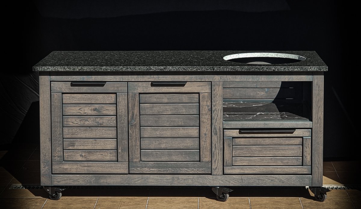 Ąžuolo masyvo, rankų darbo kamado grill stalas pritaikytas daugeliui BBQ kepsninių – Green Egg, Kamado Joe, Kamado BONO, Kamado Club, Kamado Club Pro, Mustang ir kt.