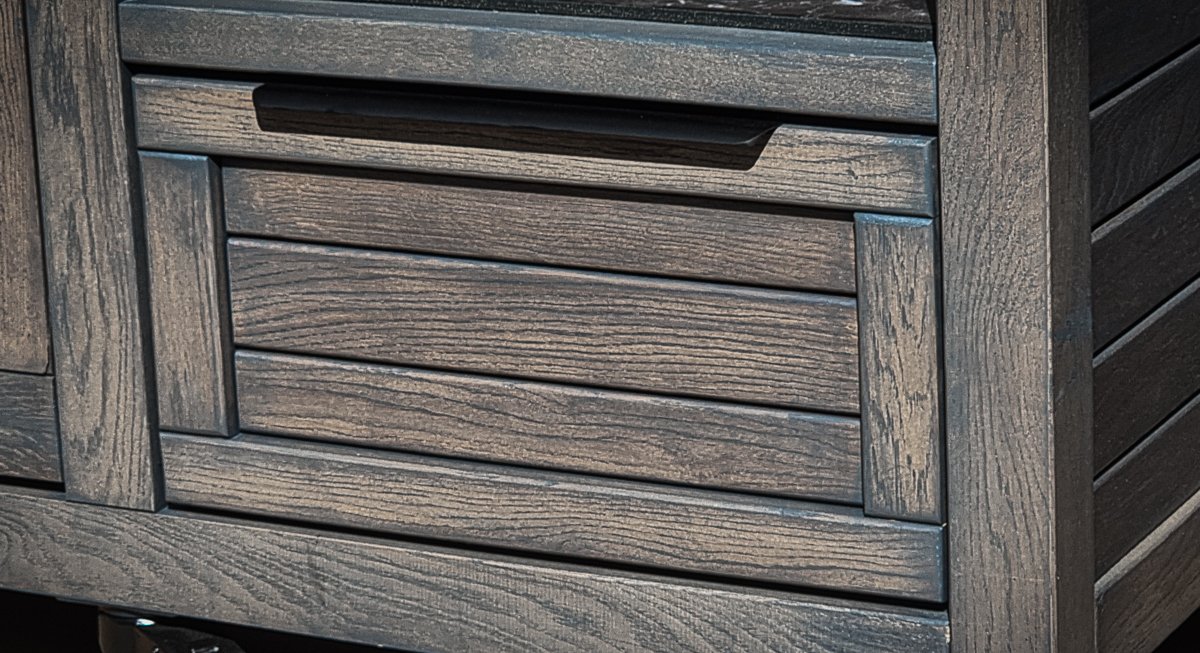 Stalviršis – HPL Compact 12mm (juodu užpildu) arba tamsus granitas.