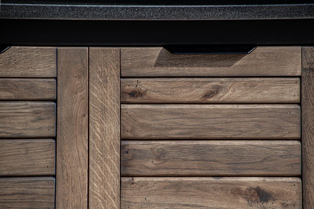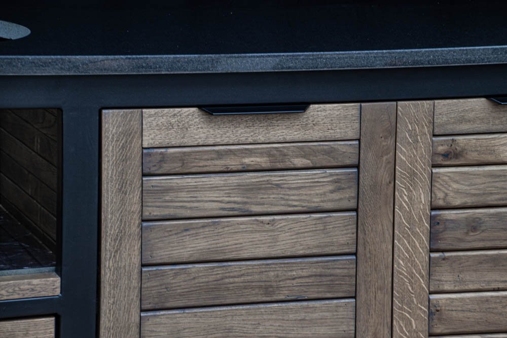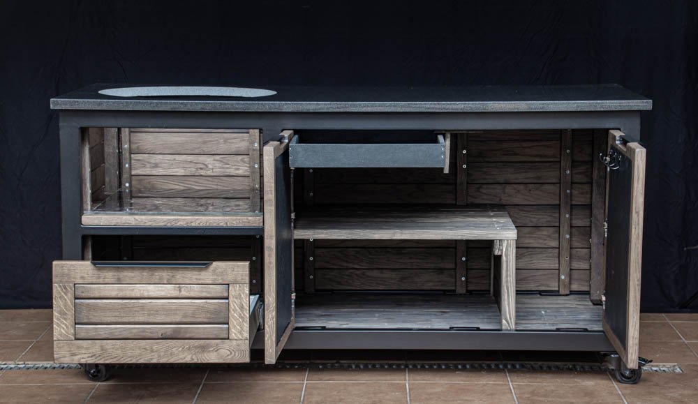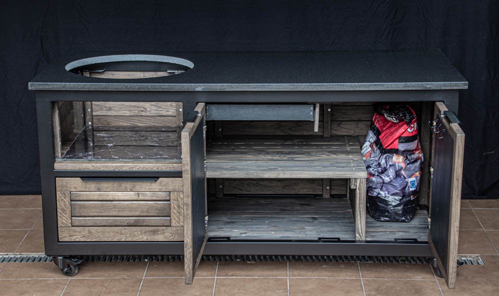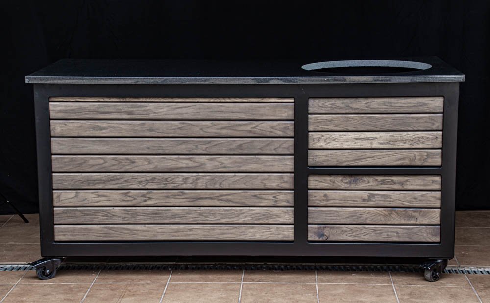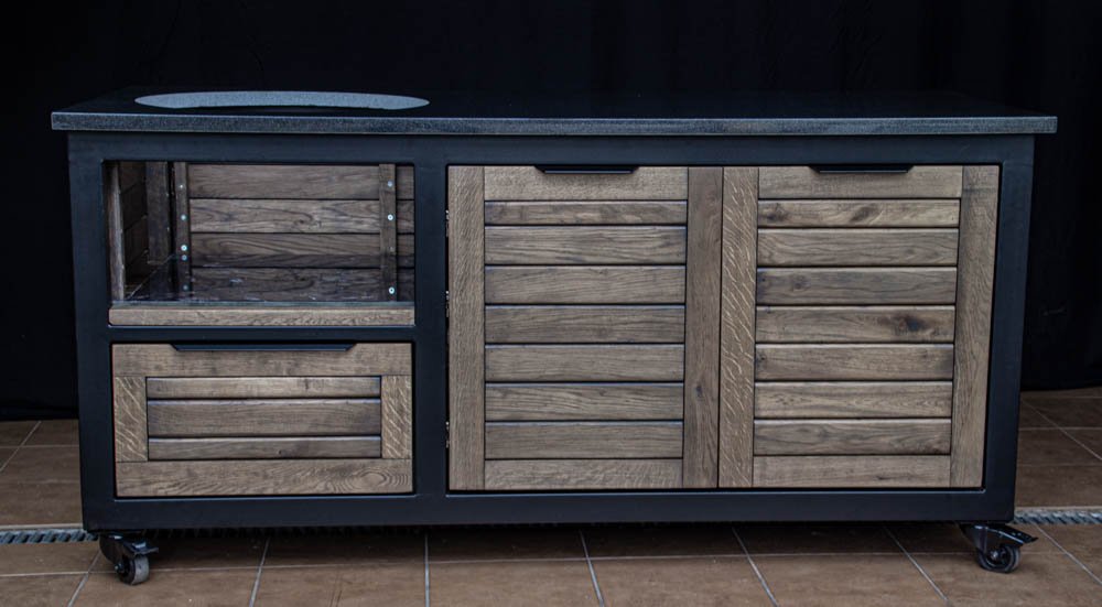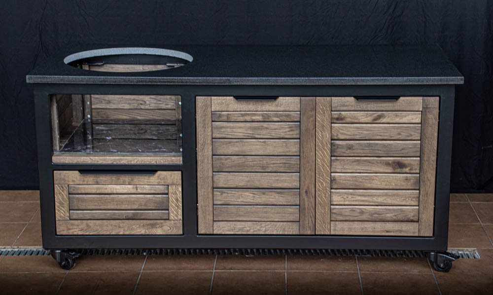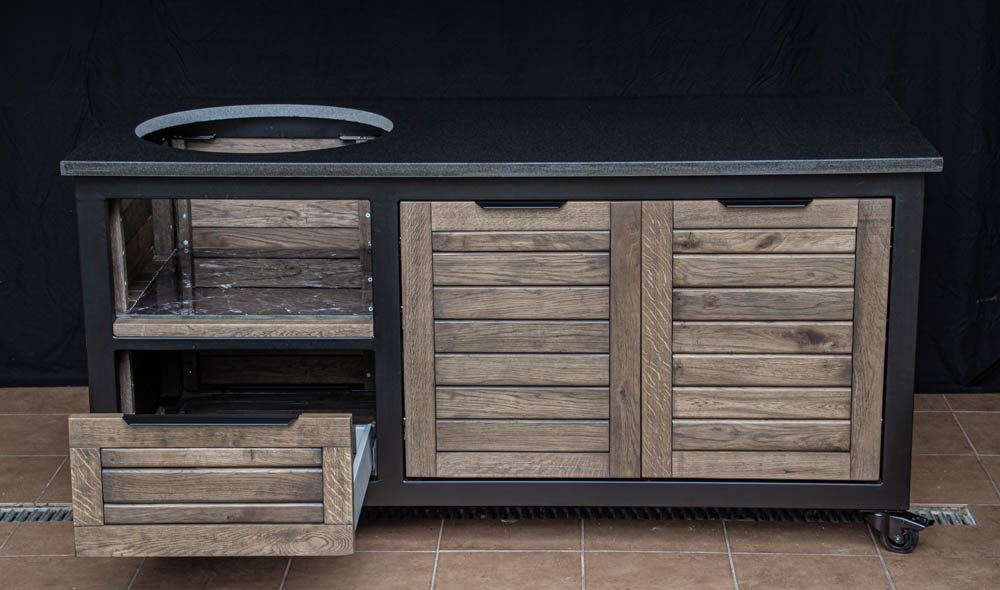 Vientisas metalo rėmas ir natūralaus Ąžuolo apdaila. Grill stalas pritaikytas daugeliui BBQ kepsninių – Green Egg, Kamado Joe, Kamado BONO, Kamado Club, Kamado Club Pro, Mustang ir kt.