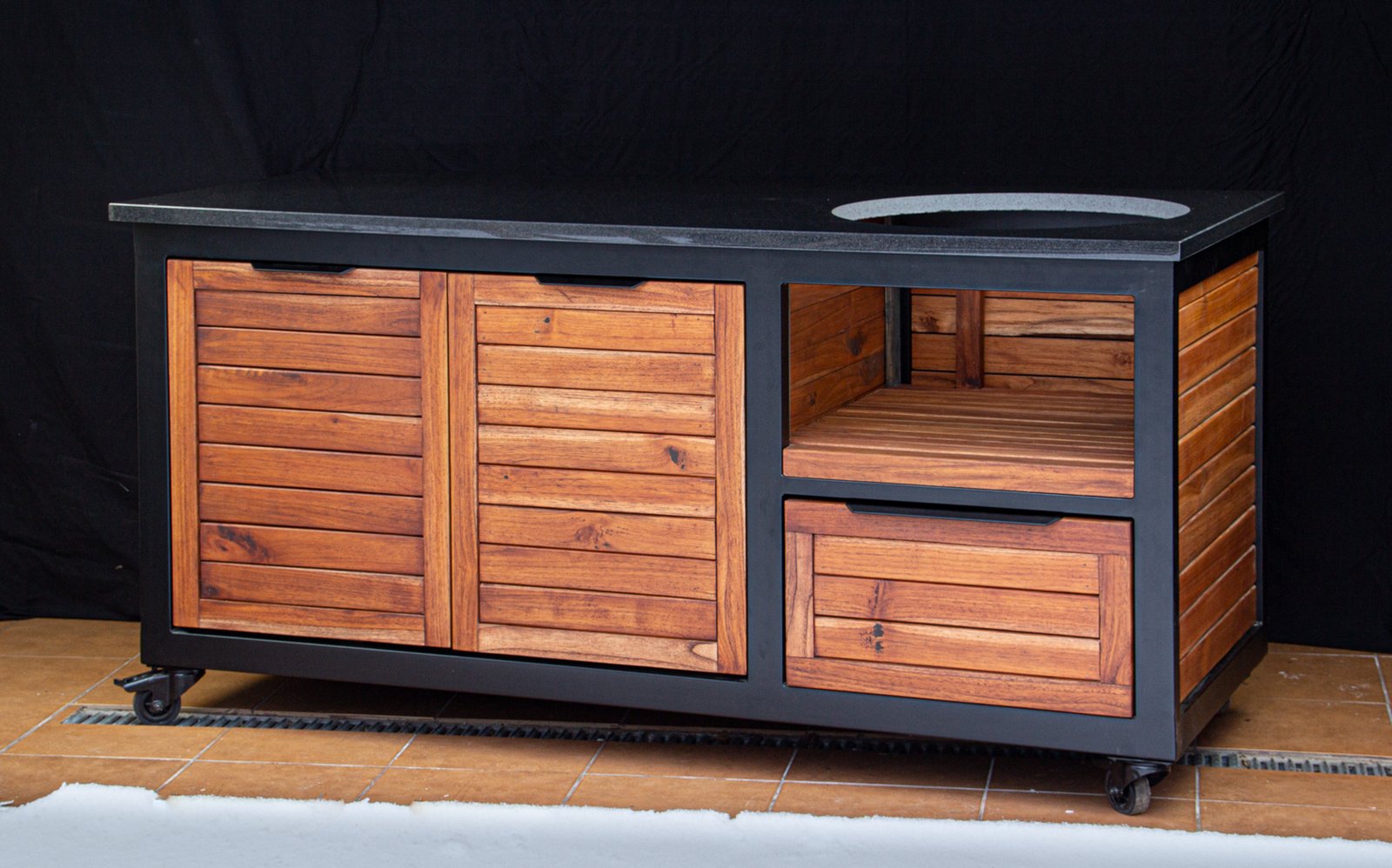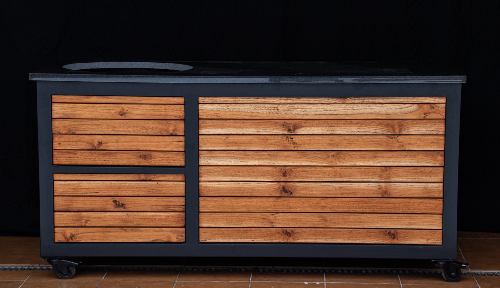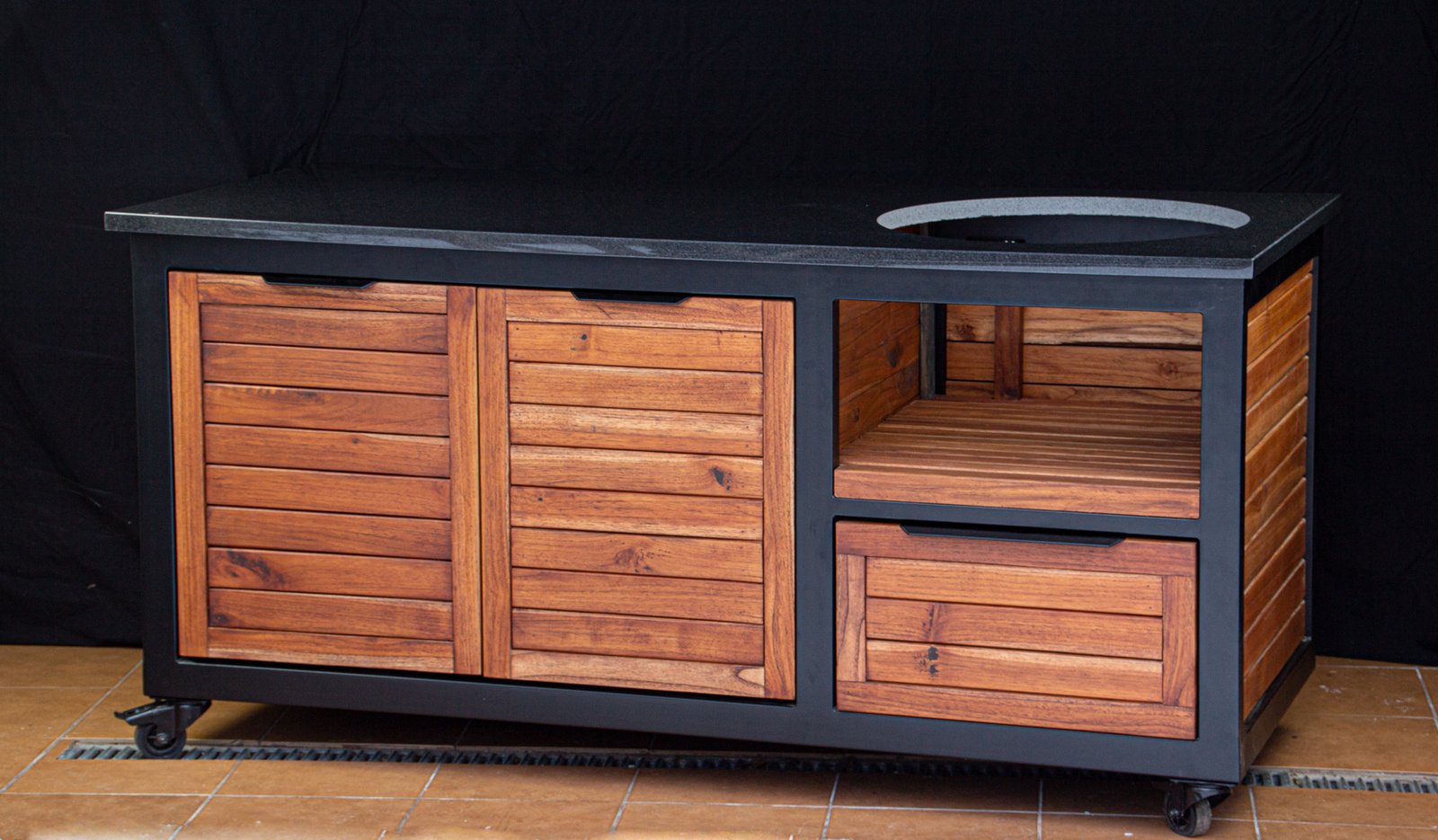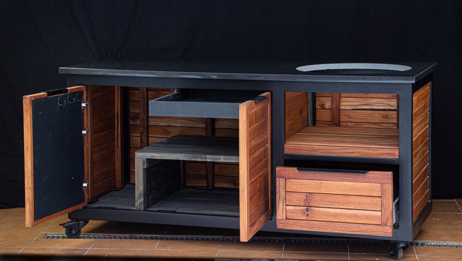Vientisas metalo rėmas ir natūralaus Tikmedžio apdaila. Grill stalas pritaikytas daugeliui BBQ kepsninių – Green Egg, Kamado Joe, Kamado BONO, Kamado Club, Kamado Club Pro, Mustang ir kt.