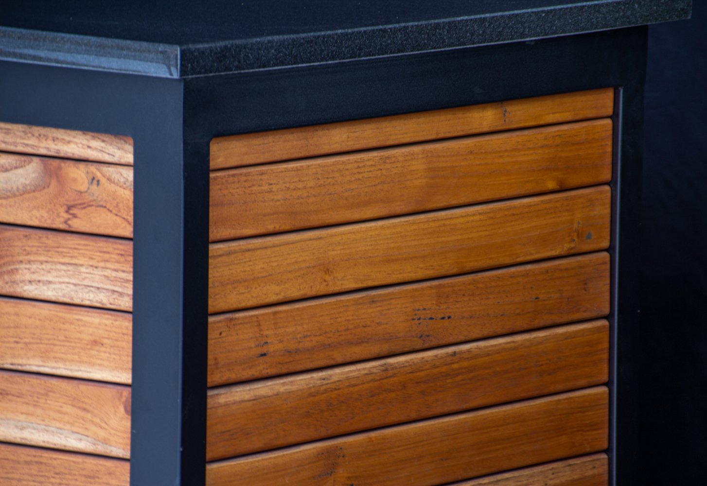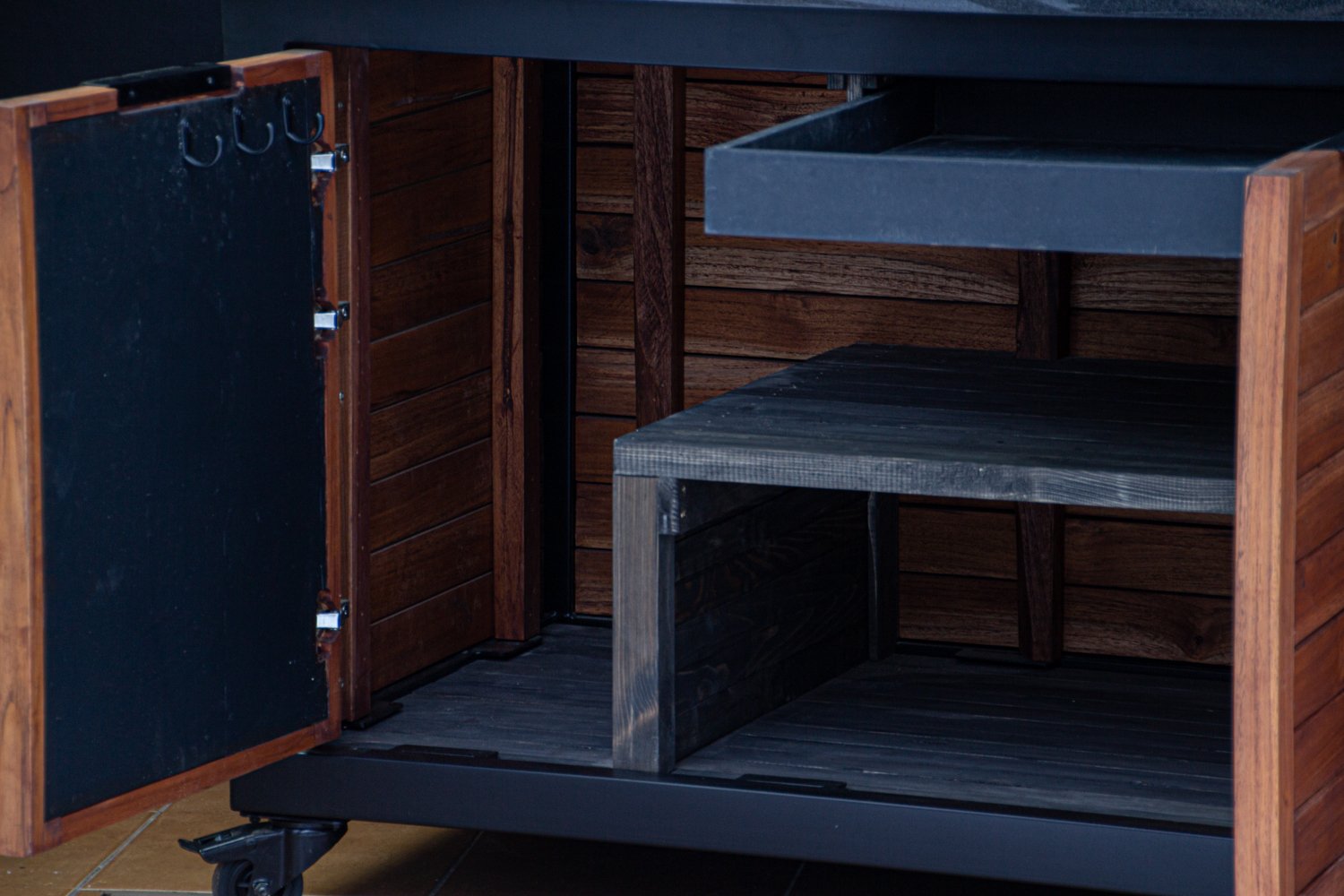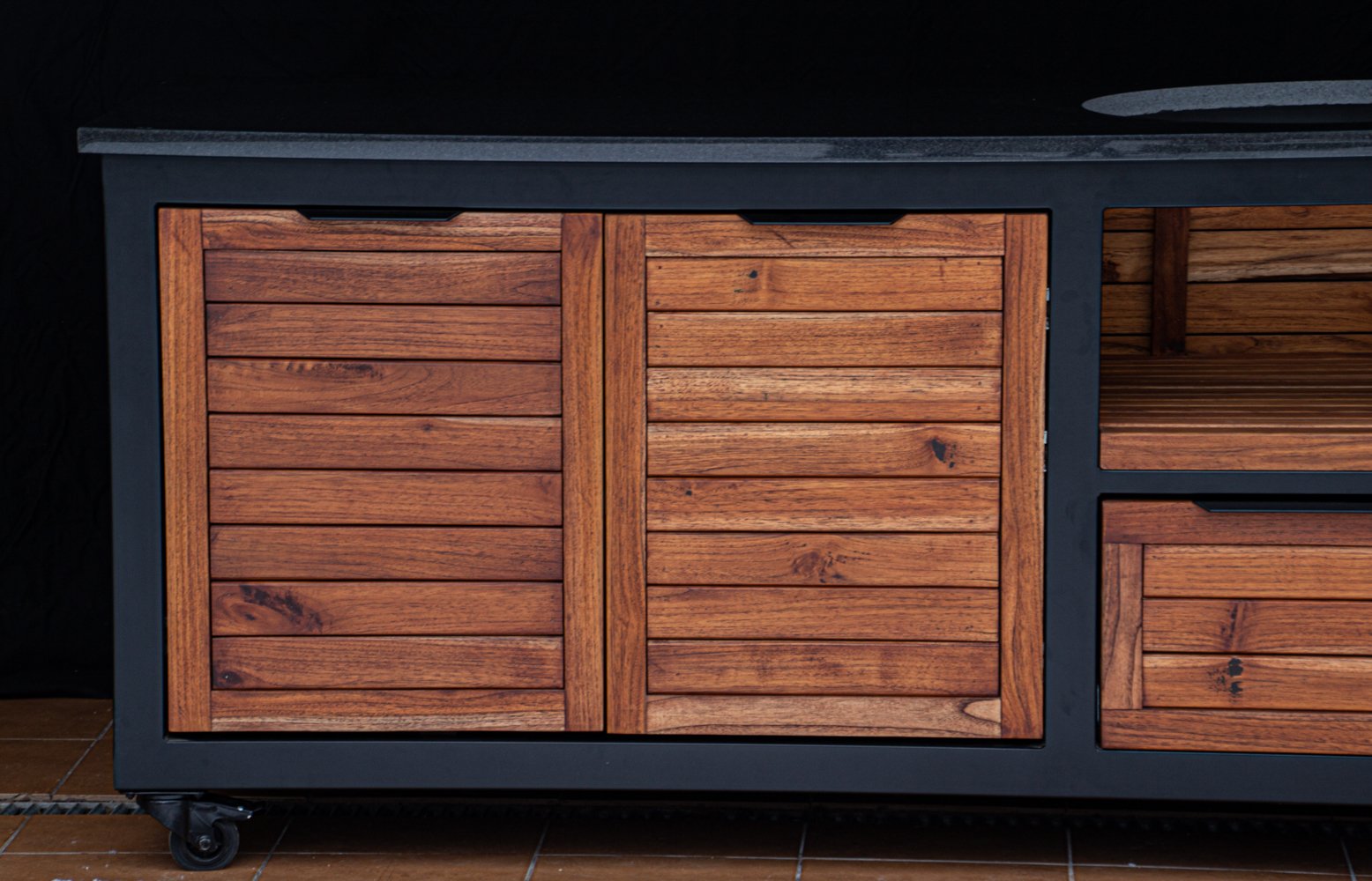 Vientisas metalo rėmas ir natūralaus Tikmedžio apdaila. Grill stalas pritaikytas daugeliui BBQ kepsninių – Green Egg, Kamado Joe, Kamado BONO, Kamado Club, Kamado Club Pro, Mustang ir kt.