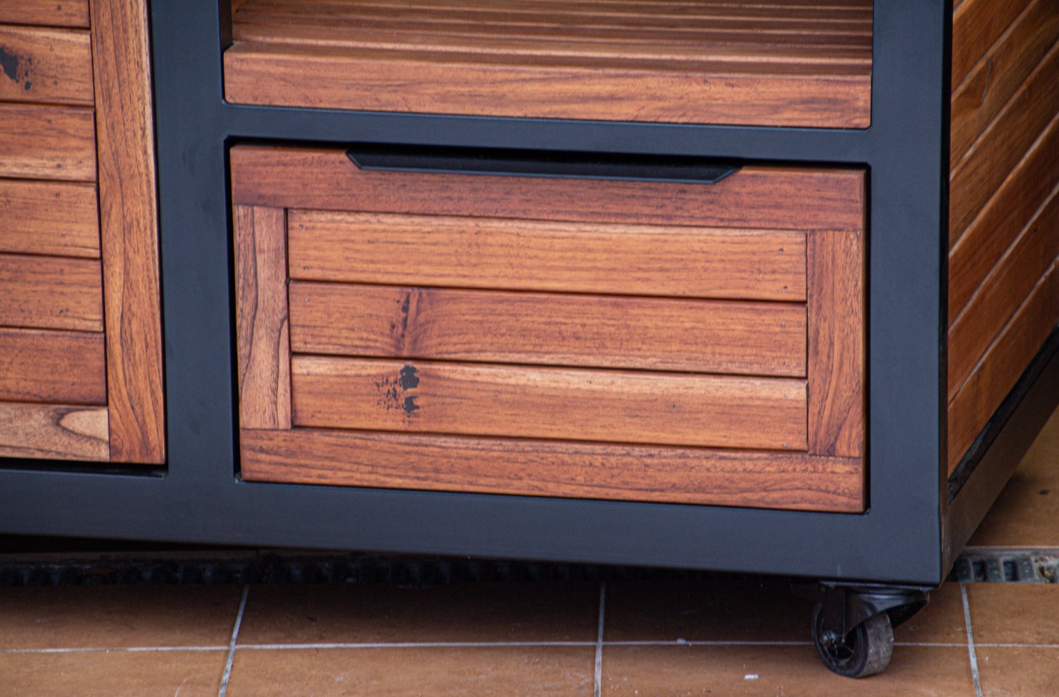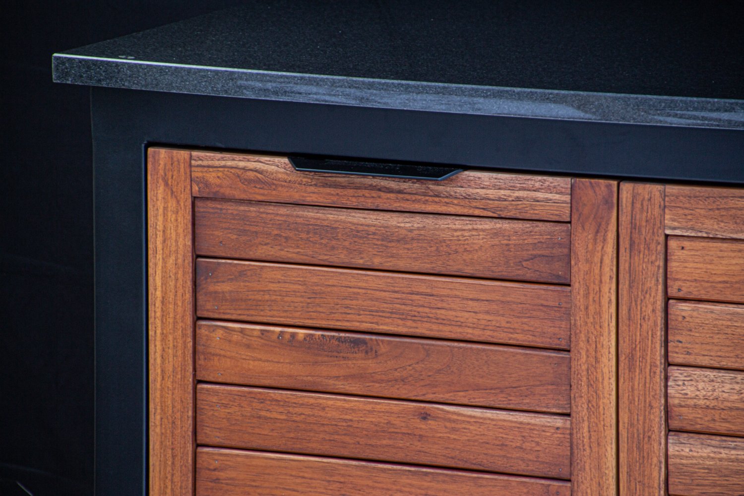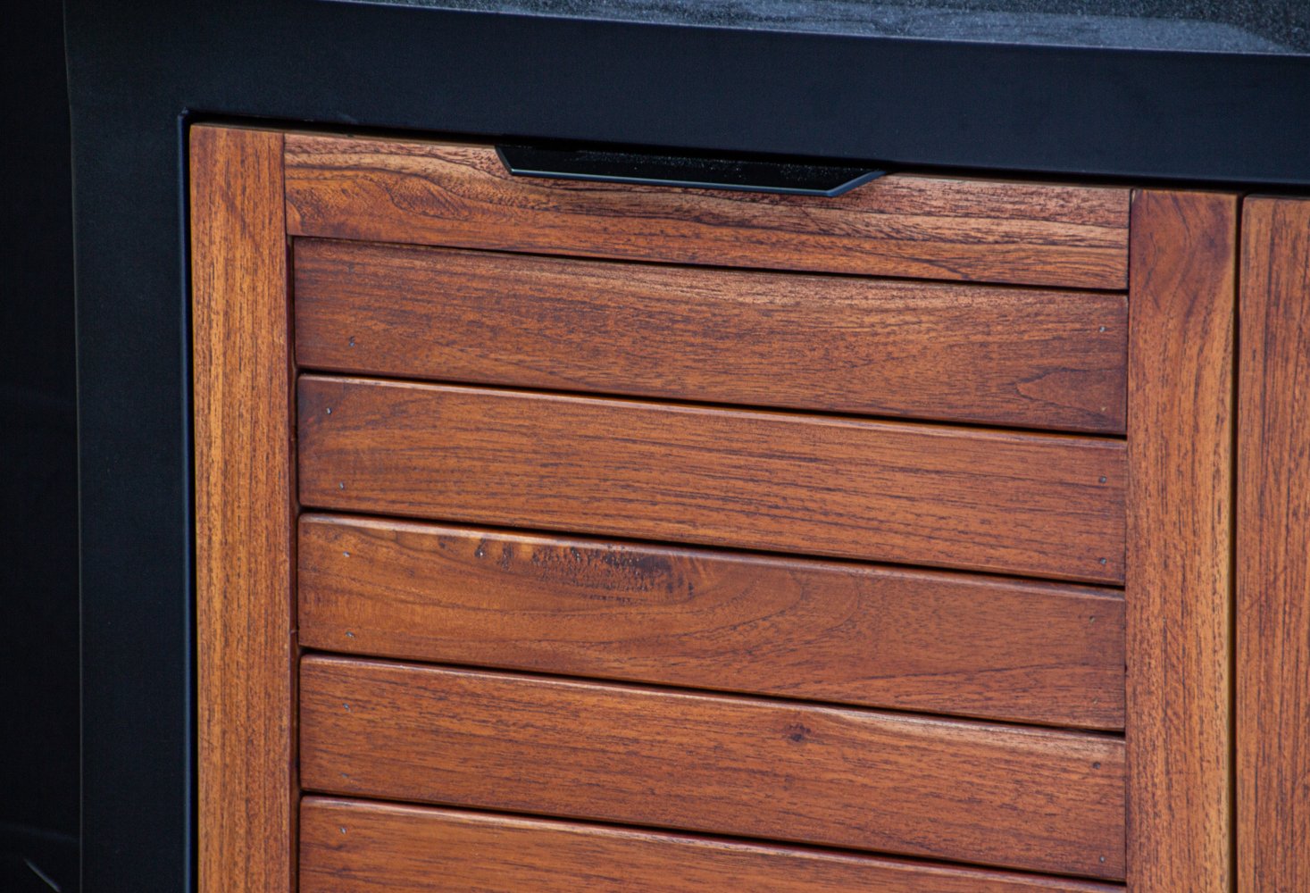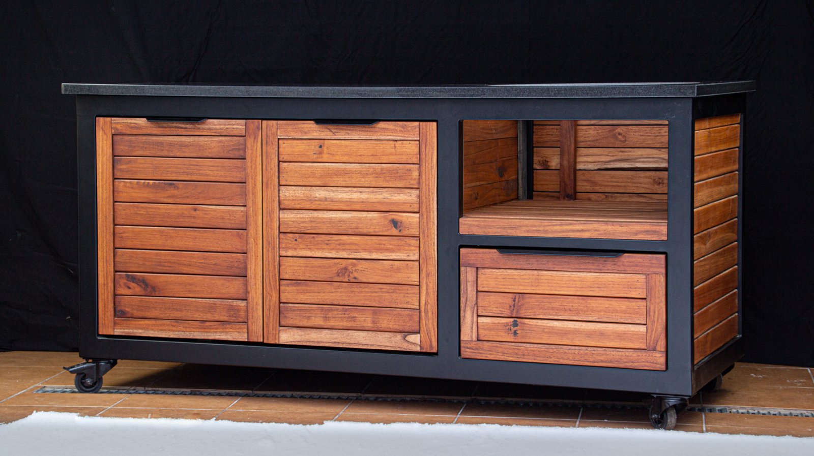 Vientisas metalo rėmas ir natūralaus Tikmedžio apdaila. Grill stalas pritaikytas daugeliui BBQ kepsninių – Green Egg, Kamado Joe, Kamado BONO, Kamado Club, Kamado Club Pro, Mustang ir kt.