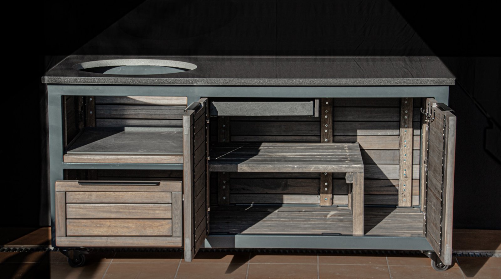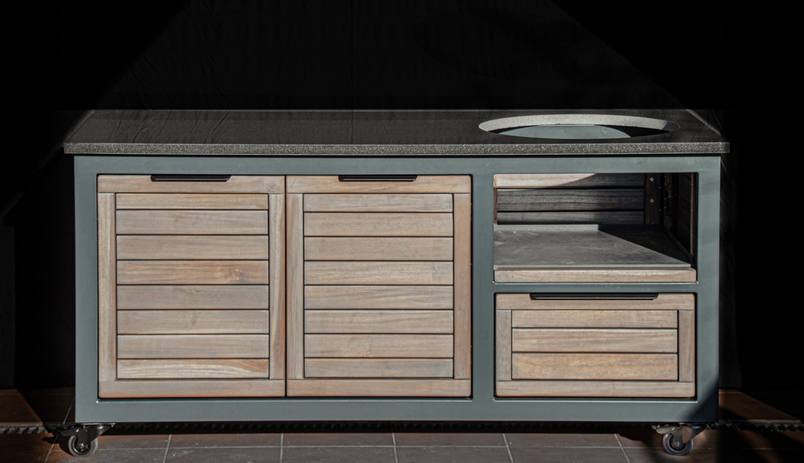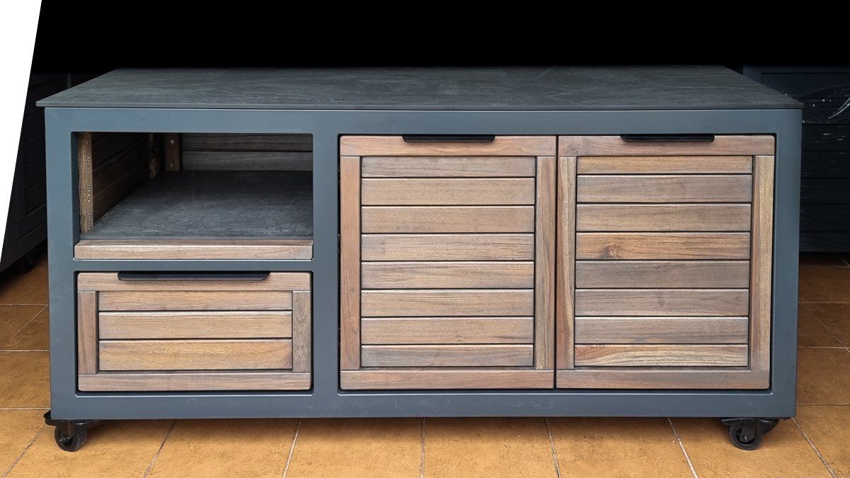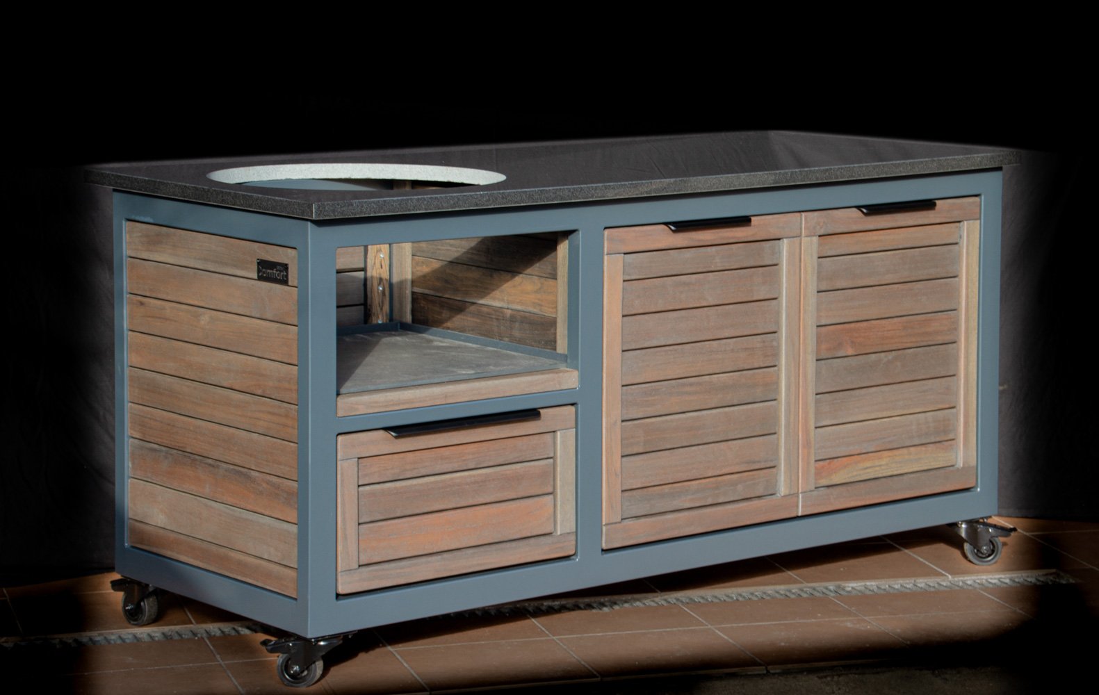 Vientisas metalo rėmas ir natūralaus Tikmedžio apdaila. Grill stalas pritaikytas daugeliui BBQ kepsninių – Green Egg, Kamado Joe, Kamado BONO, Kamado Club, Kamado Club Pro, Mustang ir kt.