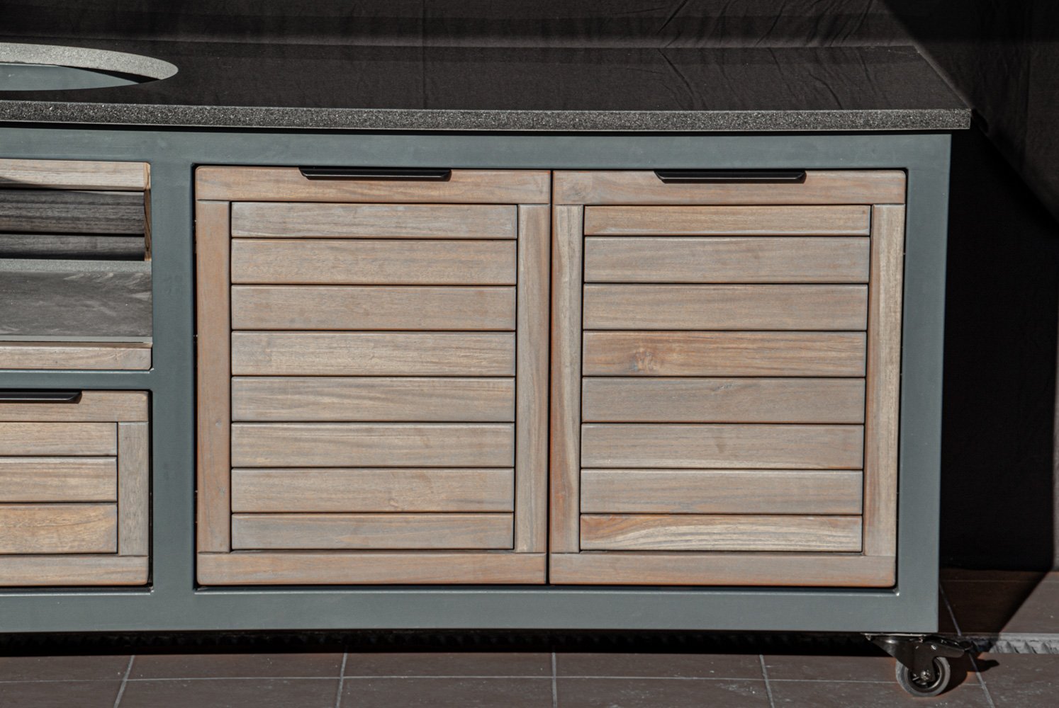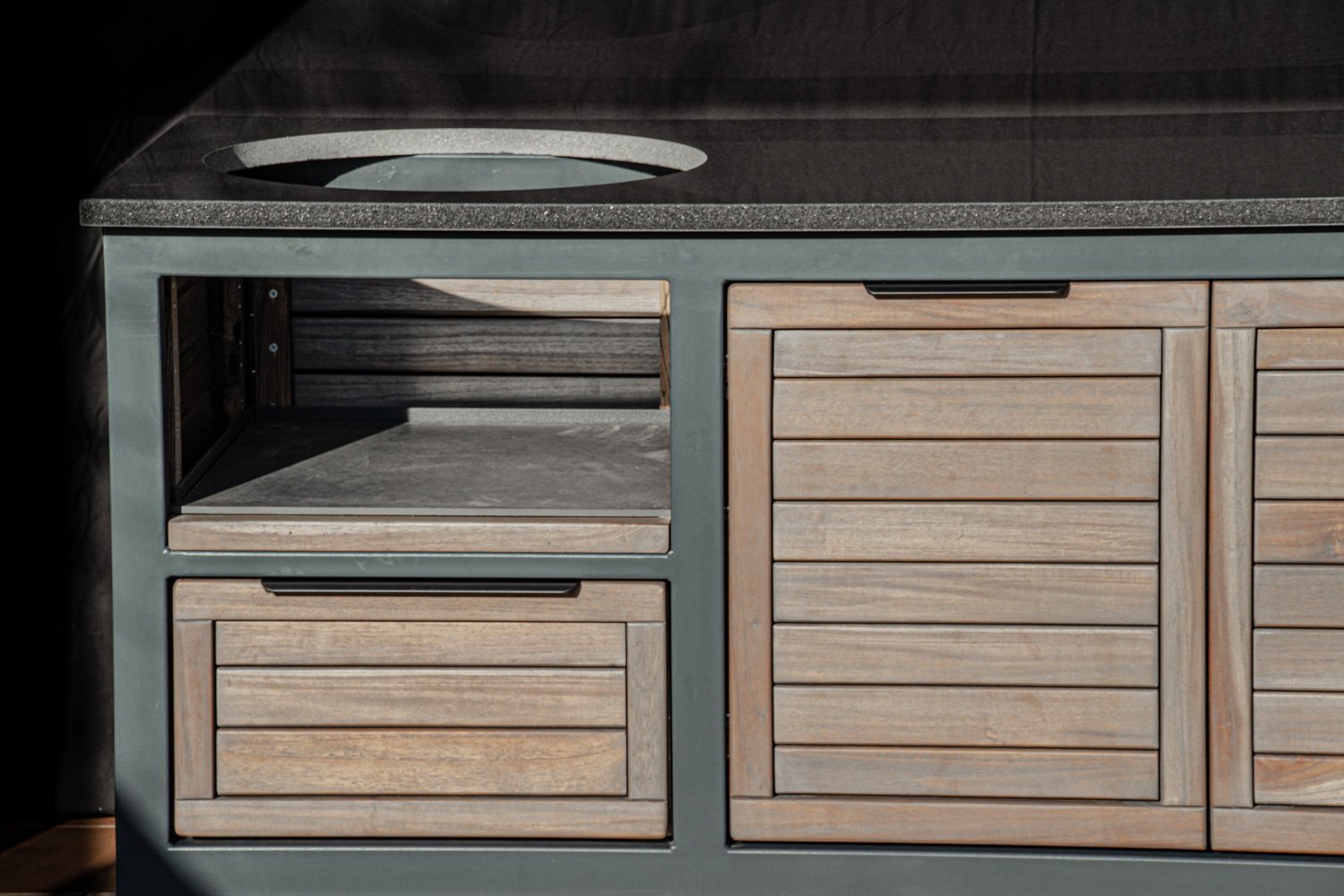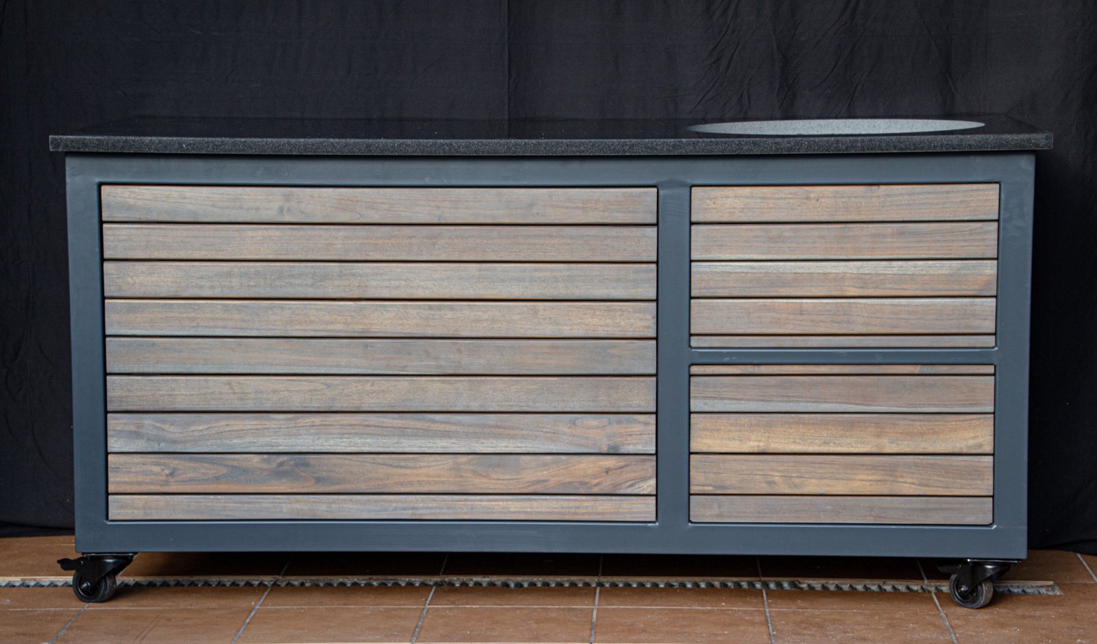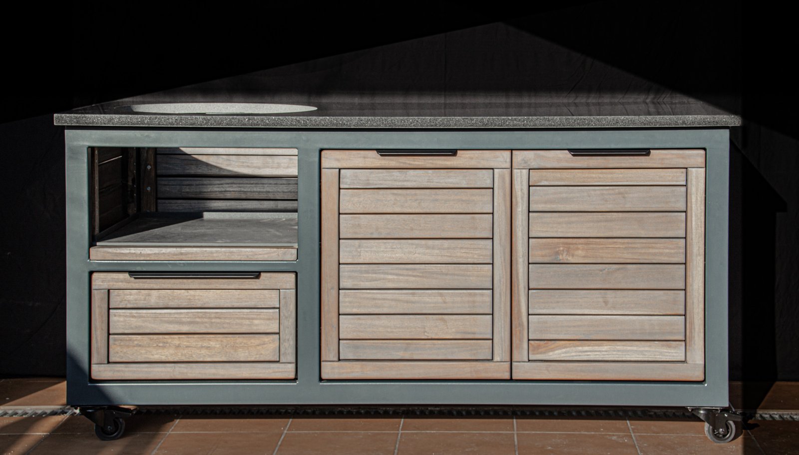Vientisas metalo rėmas ir natūralaus Tikmedžio apdaila. Grill stalas pritaikytas daugeliui BBQ kepsninių – Green Egg, Kamado Joe, Kamado BONO, Kamado Club, Kamado Club Pro, Mustang ir kt.