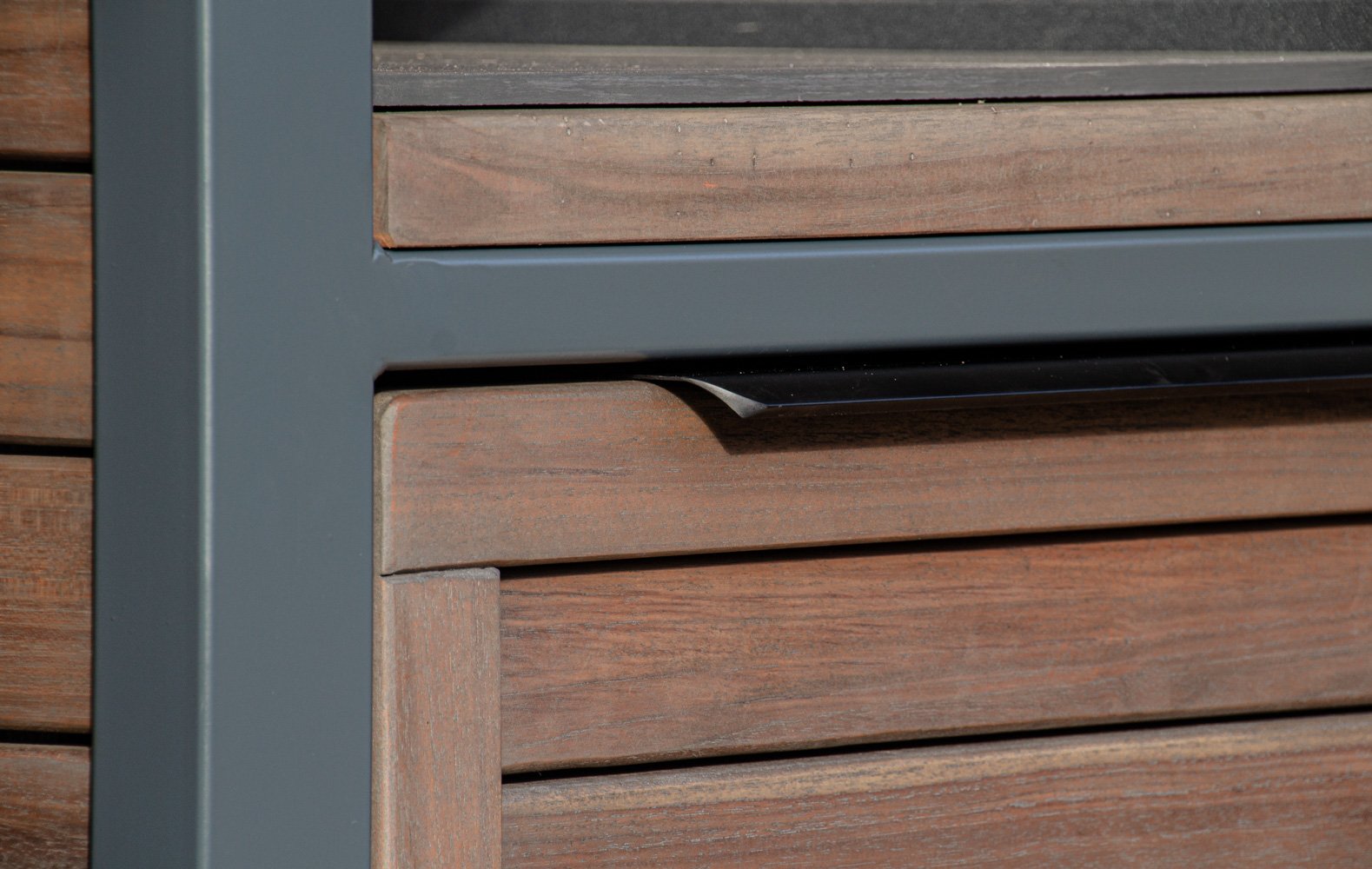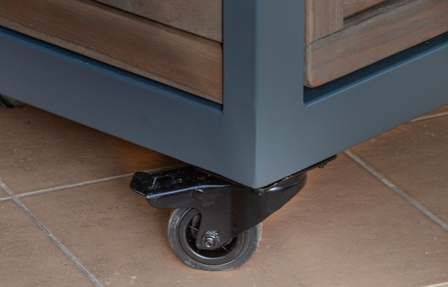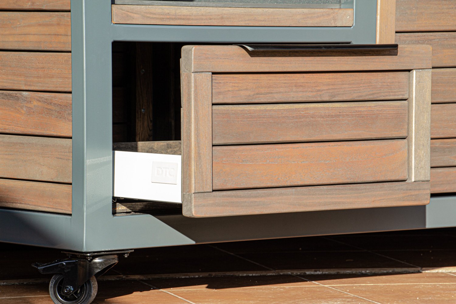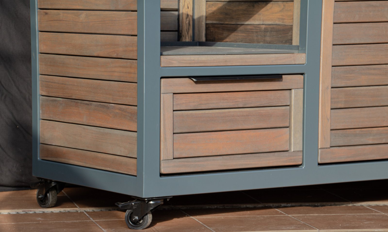 Vientisas metalo rėmas ir natūralaus Tikmedžio apdaila. Grill stalas pritaikytas daugeliui BBQ kepsninių – Green Egg, Kamado Joe, Kamado BONO, Kamado Club, Kamado Club Pro, Mustang ir kt.