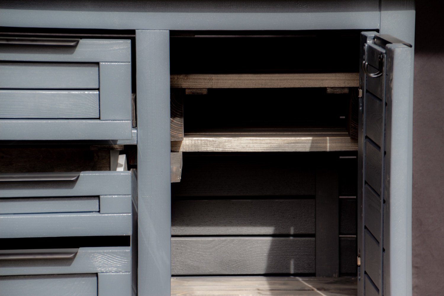 Baldo karkasas bei fasadai – natūralaus medžio masyvas, padengtas lauko baldams bei medžio fasadams skirtiems dažais.